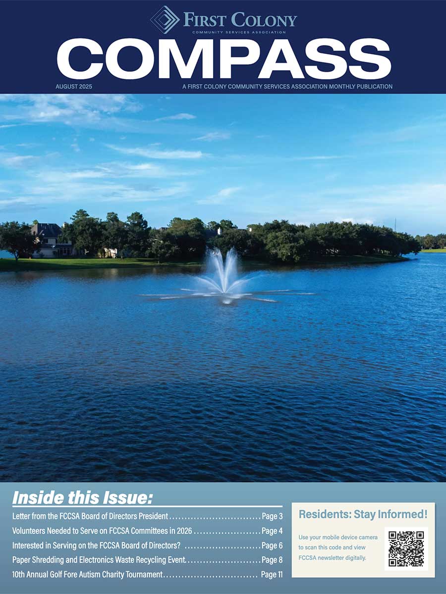 The First Colony Compass is a monthly publication of the First Colony Community Services Association. For any comments, suggestions, or for advertising questions, please the office at (281) 634-9500.